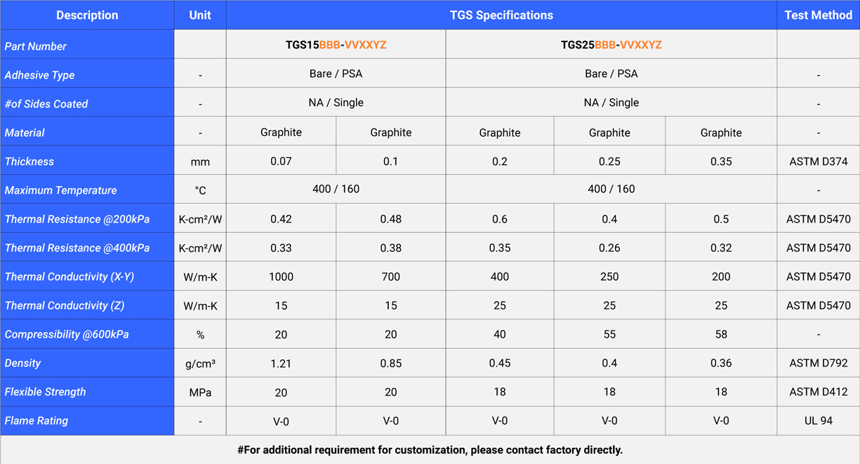 TGS 系列是一种基于热解石墨的热界面材料,在水平和垂直平面上都具有优异的热性能,可提高原始热源的传热效率。 其柔软、高弹性的特性使两个压缩表面之间具有更好的一致性和表面顺应性。这种高性能材料超薄、轻便,可根据应用要求定制不同的形状和尺寸。 这种热扩散材料通常用于手持设备,通过在大面积表面均匀地提取热量(电子设备产生的热量)来避免热点,起到超轻散热片的作用。 热解石墨的石墨烯层之间有共价键,使其在 XY 方向平面上具有很高的热性能。热解石墨是通过化学气相沉积(CVD)在极高温度下对碳氢化合物进行热解而产生的。