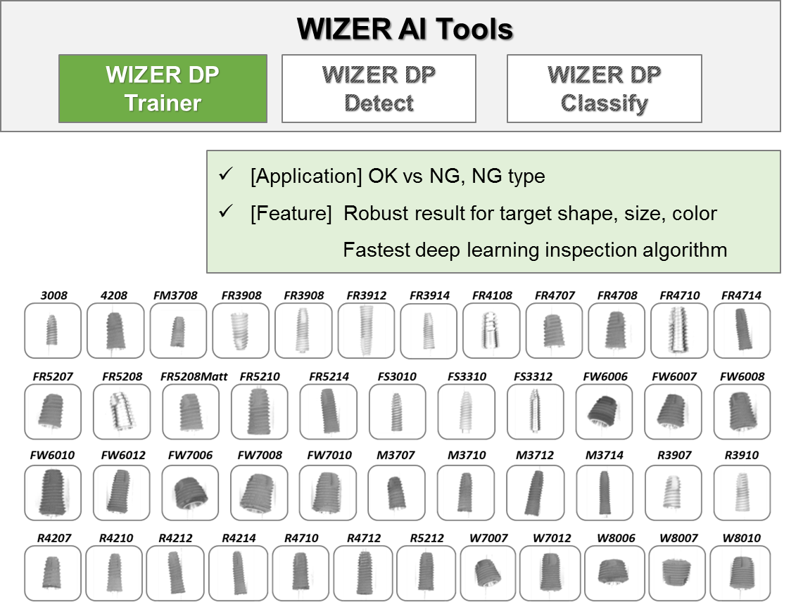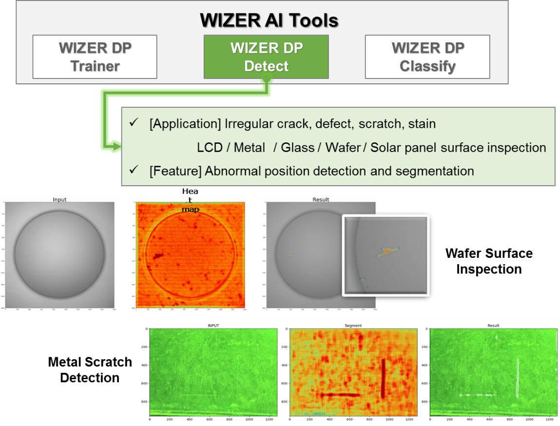 Wizer DP拥有3个AI模块以满足市场需求,其中包括Trainer、Detect&Classify。 Trainer模块需要通过培训选定的好图像和不同的NG图像来建立配方。检测模块用于检测生产零件上的缺陷,分类模块用于对缺陷类型进行分类。即使生产零件在阈值或加工标记上有一些不同的变化,深度学习也能够识别缺陷。